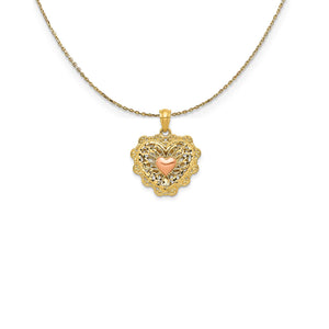 Victorian inspired heart pendant designed from 14K yellow and rose gold with white rhodium plating featuring an intricate filigree design accented with diamond cut details. This reversible pendant measures approximately 16mm wide by 20mm long, which includes the tapered bail. Includes a 16 inch long, 0.9mm wide, solid 14k yellow gold cable chain with a spring ring clasp.