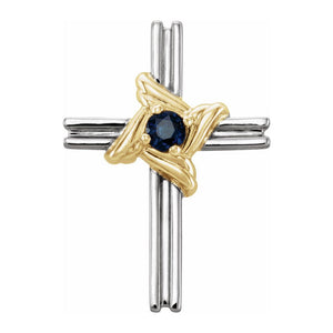 Celebrate and honor all special occasions with jewelry of religious significance! Our collection of spiritually inspired designs that show faith, hope and devotion are perfect for commemorating life's milestones. This two-tone women's cross pendant created in 14k white and yellow gold is prong set with a .08 carat genuine blue sapphire that is 2.5mm in size. The approximate pendant size is 13mm (1/2 inch) in width by 18mm (11/16 inch) in length. The chain passage dimensions of the hidden bail are 1.5 x 1.2mm. Color range varies on all natural stones so please allow for slight variations in shades (medium navy to royal blue). The color on your screen may also not reflect actual gemstone color due to variations in monitors. Gemstone treatment: traditional heated process. This item does not include a chain. This is a made to order item and is estimated to ship in about 12 days. Please email service@theblackbow.com for more details.