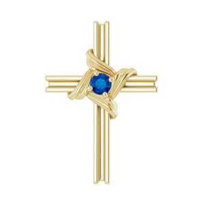Celebrate and honor all special occasions with jewelry of religious significance! Our collection of spiritually inspired designs that show faith, hope and devotion are perfect for commemorating life's milestones. This polished women's cross pendant created in 14k yellow gold is prong set with a .08 carat genuine blue sapphire that is 2.5mm in size. The approximate pendant size is 13mm (1/2 inch) in width by 18mm (11/16 inch) in length. The chain passage dimensions of the hidden bail are 1.5 x 1.2mm. Color range varies on all natural stones so please allow for slight variations in shades (medium navy to royal blue). The color on your screen may also not reflect actual gemstone color due to variations in monitors. Gemstone treatment: traditional heated process. This item does not include a chain. This is a made to order item and is estimated to ship in about 12 days. Please email service@theblackbow.com for more details.