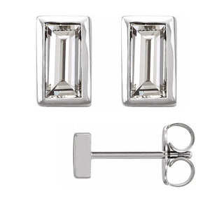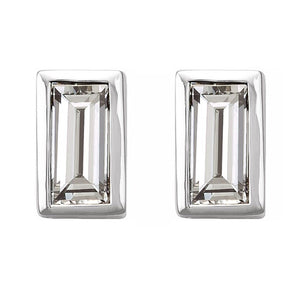 • Put a little sparkle in your style with these small bezel-set earrings made from rhodium-plated 14k white gold and straight baguette diamonds. They measure approximately 2.5 mm in width by 4.25mm in length. The 3.5 x 1.75mm step-cut genuine diamonds are G-H in color, SI2-SI3 in clarity and the total diamond weight for the pair is 1/8 of a carat. This is a made to order item and is estimated to ship in about 6-8 days. Please email service@theblackbow.com for more details.