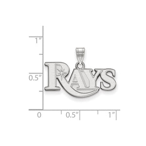 It is time to celebrate your favorite Major League Baseball (MLB) team, the Tampa Bay Rays! We are a certified retailer, and this authentic women's small laser-etched pendant is officially licensed. It is created from rhodium plated 14k white gold and approximately 23mm in width (7/8 inch or slightly larger than a nickel). Chain not included. Made in the U.S.A. This item is not currently in-stock. Once you place your order, please allow us 5 to 7 business days to make it for you.