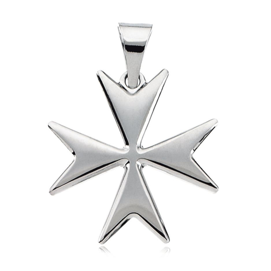The symbol of the Knights of Malta and Hospital of St. John of Jerusalem. Four spearheads converge at the center, the extensions represent the Beatitudes. This polished pendant is created from 14k white gold and measures approximately 18mm (11/16 inch) in width by 22mm (7/8 inch) in length, which includes the tapered bail. Chain not included. This is a made to order item and is estimated to ship in about 6-8 days. Please email service@theblackbow.com for more details.
