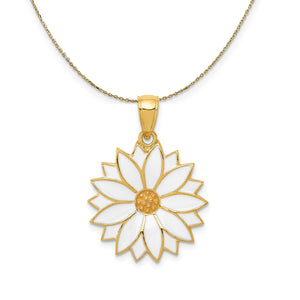 Refresh your style with a bright flower blossom created from 14k yellow gold featuring a polished and enameled finish. This gorgeous pendant is approximately 19mm (3/4 Inch) in width by 25mm (1 Inch) in length, which includes the tapered bail. Includes a 16 inch long, 0.9mm wide, solid 14k yellow gold cable chain with a spring ring clasp.