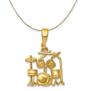 Jazz up your style with a gleaming 14k white gold pendant depicting your favorite musical instrument. This detailed drum set features a two-dimensional open back design that is approximately 17mm (5/8 Inch) in width by 26mm (1 Inch) in length, which includes the tapered bail. Includes a 24 inch, 0.8mm 14k yellow gold cable chain with a lobster clasp.
