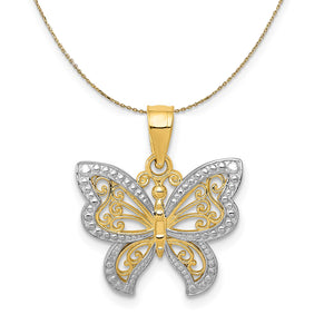 Symbolic of change, elegance, growth, transformation, and more, the butterfly is a treasure trove of good omens. This gleaming pendant fashioned from 14k yellow gold and white rhodium plating is approximately 17mm (5/8 Inch) in width by 19mm (3/4 Inch) in length, which includes the tapered bail. Includes a 18 inch long, 0.9mm wide, solid 14k yellow gold cable chain with a spring ring clasp.