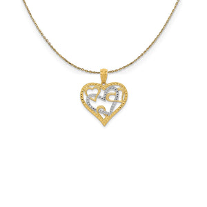 A family of open hearts interlocked for eternity in 14k yellow gold accented with white rhodium plating. This polished pendant features a textured and diamond cut design that measures approximately 18mm wide by 21mm long including the tapered bail. Includes a 24 inch long, 0.9mm wide, solid 14k yellow gold cable chain with a spring ring clasp.