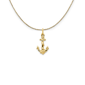 Out to sea style, this rope wrapped anchor crafted from 14K yellow gold features a solid, diamond-cut design with a polished finish. It measures approximately 10mm (3/8 Inch) wide by 22mm (7/8 Inch) long including the jump ring. Includes a 18 inch long, 0.9mm wide, solid 14k yellow gold cable chain with a spring ring clasp.