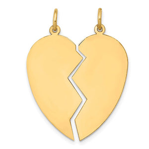 This heart set of 2 charm pendant is crafted with solid 14 karat yellow gold and it features a polished finish with an engravable design and flat back. The approximate size is 26 mm x 28 mm and its average item weight is 2.17 grams. This item does not include a chain.
