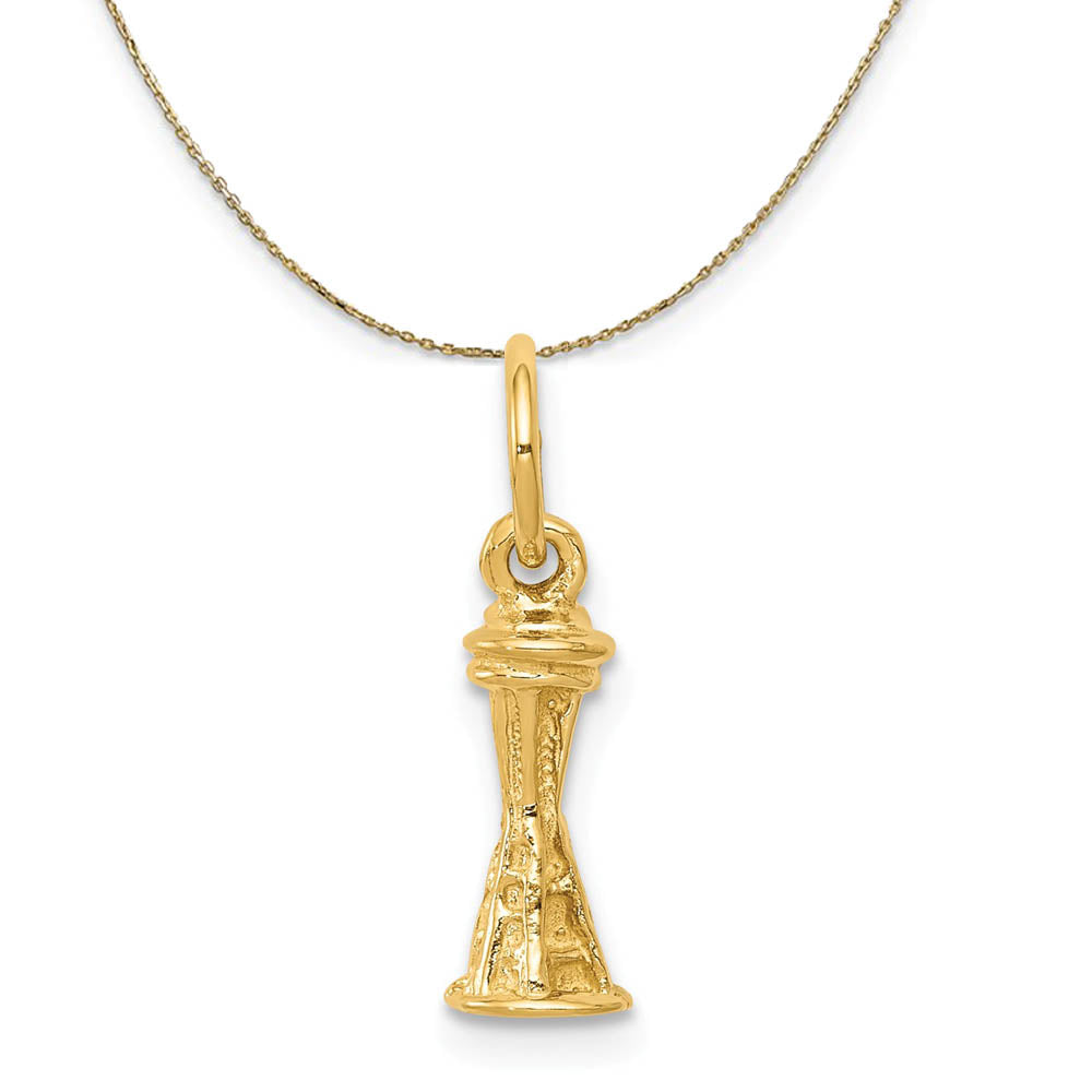 Capture the unforgettable moments of a past journey or keep your future travel dreams alive with this 14k yellow gold Seattle Space Needle charm. It features a polished 3-dimensional design and is approximately 4mm (3/16 inch) in width by 17mm (5/8 Inch) in length, which includes the jump ring. The pendant is Includes a 30 Inch, 0.8mm 14k yellow gold cable chain with a lobster clasp.