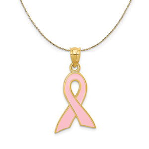 Tie the meaning to the moment with a classic or unusual pendant that makes it personal, thoughtful, or meaningful. This pink enameled awareness ribbon pendant is crafted in solid 14k yellow gold with pink enamel and features a polished finish with a textured back. The approximate size is 15mm x 29mm. Includes a 16 inch long, 0.9mm wide, solid 14k yellow gold cable chain with a spring ring clasp.