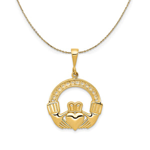 Tie the meaning to the moment with a classic or unusual pendant that makes it personal, thoughtful, or meaningful. This claddagh pendant crafted in 14k yellow gold features a polished and satin finish. The approximate size is 21mm (13/16 inch) in width by 32mm (1 1/4 inch) in length with the bail. Includes a 16 inch long, 0.9mm wide, solid 14k yellow gold cable chain with a spring ring clasp.