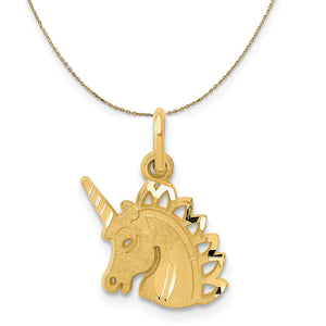 Take some mythical magic along with you every day with this beautiful unicorn charm fashioned from 14k yellow gold. It features a flat detailed design with a satin and diamond-cut finish that is approximately 11mm (7/16 Inch) in width by 13mm (1/2 Inch) in length and is finished with a classic jump ring. The pendant is . Includes a 18 inch, 0.8mm 14k yellow gold cable chain with a lobster clasp.