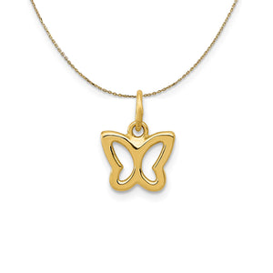 Tie the meaning to the moment with a classic or unusual pendant that makes it personal, thoughtful, or meaningful. This tiny butterfly charm or pendant crafted in polished 14k yellow gold features a hollow cutout design. The approximate size is 9mm (3/8 inch) in width by 12mm (7/16 inch) in length with the jump ring. Includes a 16 inch long, 0.9mm wide, solid 14k yellow gold cable chain with a spring ring clasp.
