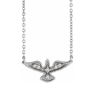 Celebrate and honor all special occasions with jewelry of religious significance! Our collection of spiritually inspired designs that show faith, hope and devotion are perfect for commemorating life's milestones. This petite dove necklace created in rhodium-plated 14k white gold is prong set with 6 natural diamonds that are I1 in clarity and G-H in color. The total diamond weight is 0.05 carat. The approximate pendant size is 17mm (5/8 inch) in width by 9mm (3/8 inch) in length. The attached diamond-cut cable chain closes with a spring ring clasp, is 1mm in width by 18 inches in length. This is a made to order item and is estimated to ship 11/24/2025