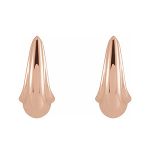 Flattering and versatile, these small polished J-hoop earrings made of 14k rose gold feature a tapered, hollow design that is approximately 6mm (1/4 inch) in width by 10mm (3/8 inch) in length. Friction backs included. This is a made to order item and is estimated to ship in about 12 days. Please email service@theblackbow.com for more details.