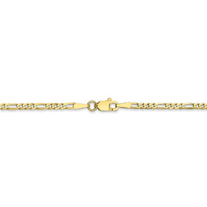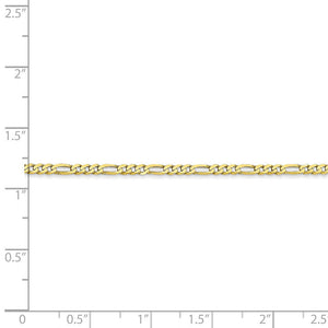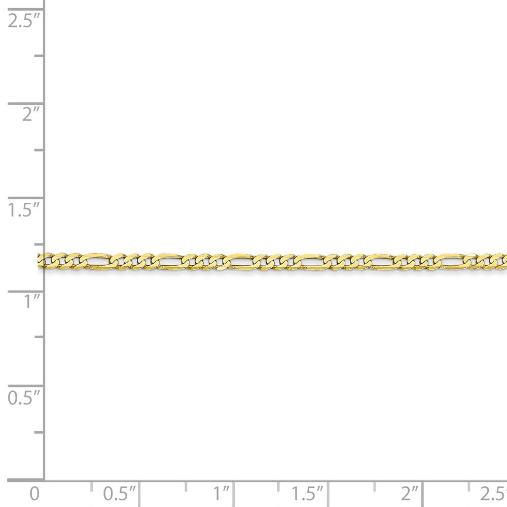 Our 10k yellow gold, figaro chain closes with a secure lobster clasp and features a solid link construction with a polished concaved design. Measuring 2.2mm in width by 8 inches in length.