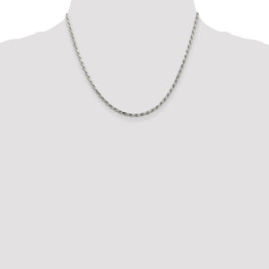 Spiraling rope chains made of sterling silver enhanced with a rhodium plated and diamond-cut finish are extremely popular because they offer a classic design with maximum shine that is tarnish resistant. Flexible and strong, this 2.5mm width, 20-inch long necklace chain fastens with a lobster claw clasp.