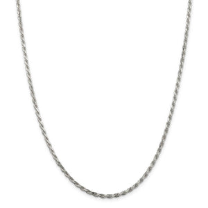 Spiraling rope chains made of sterling silver enhanced with a rhodium plated and diamond-cut finish are extremely popular because they offer a classic design with maximum shine that is tarnish resistant. Flexible and strong, this 2.5mm width, 24-inch long necklace chain fastens with a lobster claw clasp.