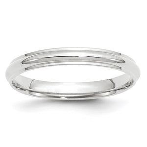 A simple curving band of rhodium-plated 14k white gold combines tradition with today's trends. This polished ring features a dome style center with narrow ridged edges and a standard fit shank. It is approximately 1.4mm in thickness (standard weight) and 3mm in width. Suitable for engraving.