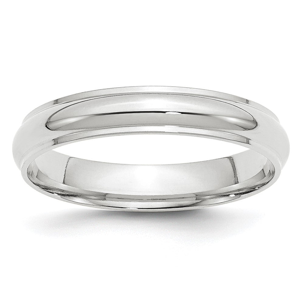 A simple curving band of rhodium-plated 14k white gold combines tradition with today's trends. This polished ring features a dome style center with narrow ridged edges and a standard fit shank. It is approximately 1.4mm in thickness (standard weight) and 4mm in width. Suitable for engraving.