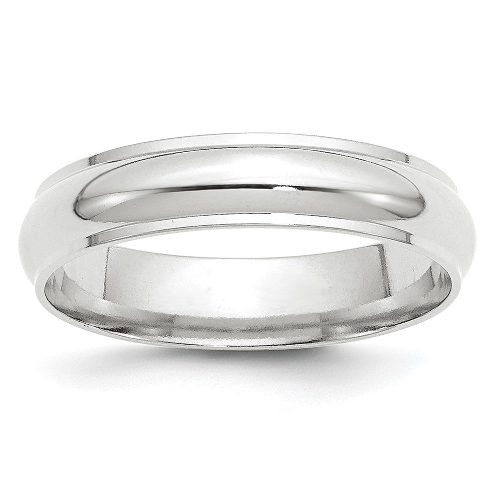 A simple curving band of rhodium-plated 14k white gold combines tradition with today's trends. This polished ring features a dome style center with narrow ridged edges and a standard fit shank. It is approximately 1.4mm in thickness (standard weight) and 5mm in width. Suitable for engraving.