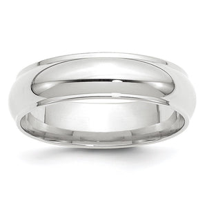 A simple curving band of rhodium-plated 14k white gold combines tradition with today's trends. This polished ring features a dome style center with narrow ridged edges and a standard fit shank. It is approximately 1.4mm in thickness (standard weight) and 6mm in width. Suitable for engraving.