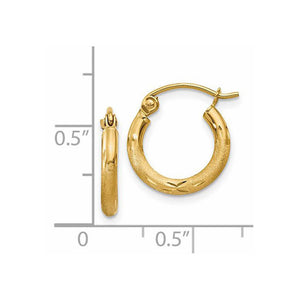 2mm x 13mm 14k Yellow Gold Satin & Diamond-Cut Round Hoop Earrings - Black Bow Jewelry Company