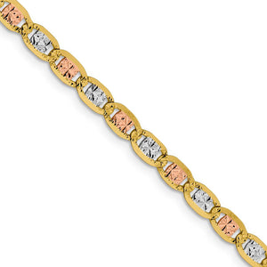 Displaying a contemporary design with pave-cut oval links that provide added dimension and sparkle, this fancy tri-color anchor chain with its solid link construction of polished 14k yellow gold with rose and white rhodium plating will give any outfit a glamorous touch. Measuring 4.75mm in width by 16-inches in length and closes with a lobster claw clasp.