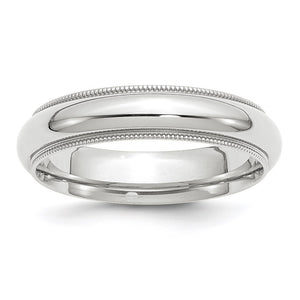 A tried and true favorite style featuring a half round or low domed center with milgrain edges created from rhodium-plated 14k white gold. This polished unisex band has a comfort fit shank, is approximately 2mm in thickness (standard weight) and 5mm in width. Suitable for engraving.�