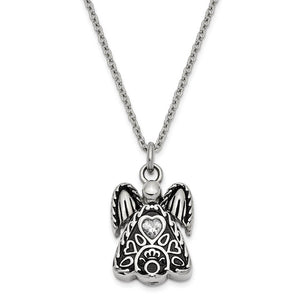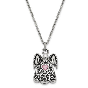 Carry a precious keepsake of a lost loved one with you every day using a remembrance ash holder that best represents them. Designed from stainless steel, this antiqued angel measuring approximately 7mm (1/4 inch) in thickness, 19mm (3/4 inch) in width by 22mm (7/8 inch) in length features a polished back, a screw opening on the bottom and a pink heart shaped cubic zirconia stone representing the month of October. It comes ready to wear on a 2mm width, 18 inch long cable chain finished with a fancy lobster clasp. Included with each purchase is a small funnel for filling and a comforting poem card printed in English and Spanish.