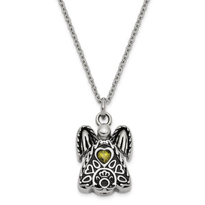 Carry a precious keepsake of a lost loved one with you every day using a remembrance ash holder that best represents them. Designed from stainless steel, this antiqued angel measuring approximately 7mm (1/4 inch) in thickness, 19mm (3/4 inch) in width by 22mm (7/8 inch) in length features a polished back, a screw opening on the bottom and a greenish yellow heart shaped cubic zirconia stone representing the month of August. It comes ready to wear on a 2mm width, 18 inch long cable chain finished with a fancy lobster clasp. Included with each purchase is a small funnel for filling and a comforting poem card printed in English and Spanish.
