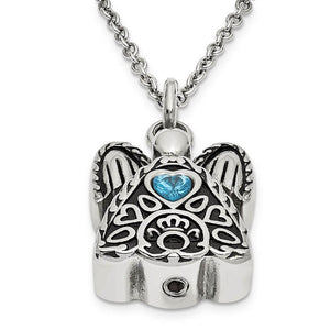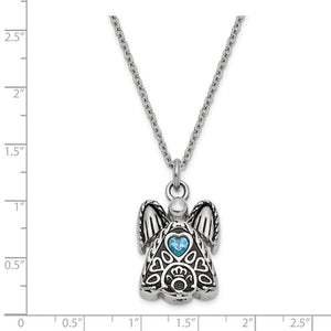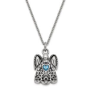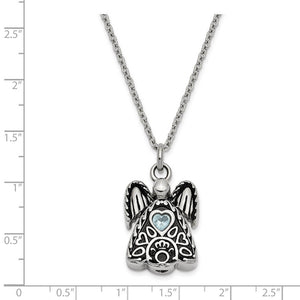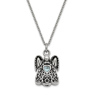 Carry a precious keepsake of a lost loved one with you every day using a remembrance ash holder that best represents them. Designed from stainless steel, this antiqued angel measuring approximately 7mm (1/4 inch) in thickness, 19mm (3/4 inch) in width by 22mm (7/8 inch) in length features a polished back, a screw opening on the bottom and a light aqua heart shaped cubic zirconia stone representing the month of March. It comes ready to wear on a 2mm width, 18 inch long cable chain finished with a fancy lobster clasp. Included with each purchase is a small funnel for filling and a comforting poem card printed in English and Spanish.