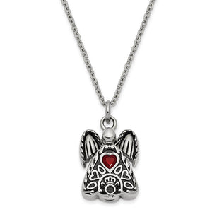 Carry a precious keepsake of a lost loved one with you every day using a remembrance ash holder that best represents them. Designed from stainless steel, this antiqued angel measuring approximately 7mm (1/4 inch) in thickness, 19mm (3/4 inch) in width by 22mm (7/8 inch) in length features a polished back, a screw opening on the bottom and a dark red heart shaped cubic zirconia stone representing the month of January. It comes ready to wear on a 2mm width, 18 inch long cable chain finished with a fancy lobster clasp. Included with each purchase is a small funnel for filling and a comforting poem card printed in English and Spanish.