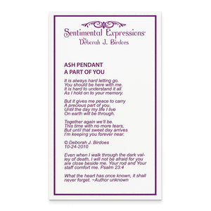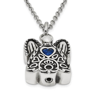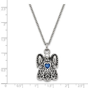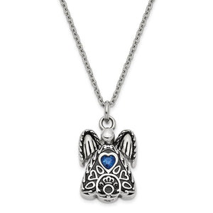 Carry a precious keepsake of a lost loved one with you every day using a remembrance ash holder that best represents them. Designed from stainless steel, this antiqued angel measuring approximately 7mm (1/4 inch) in thickness, 19mm (3/4 inch) in width by 22mm (7/8 inch) in length features a polished back, a screw opening on the bottom and a dark blue heart shaped cubic zirconia stone representing the month of September. It comes ready to wear on a 2mm width, 18 inch long cable chain finished with a fancy lobster clasp. Included with each purchase is a small funnel for filling and a comforting poem card printed in English and Spanish.
