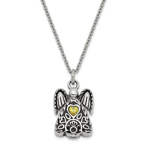 Carry a precious keepsake of a lost loved one with you every day using a remembrance ash holder that best represents them. Designed from stainless steel, this antiqued angel measuring approximately 7mm (1/4 inch) in thickness, 19mm (3/4 inch) in width by 22mm (7/8 inch) in length features a polished back, a screw opening on the bottom and a yellow heart shaped cubic zirconia stone representing the month of November. It comes ready to wear on a 2mm width, 18 inch long cable chain finished with a fancy lobster clasp. Included with each purchase is a small funnel for filling and a comforting poem card printed in English and Spanish.