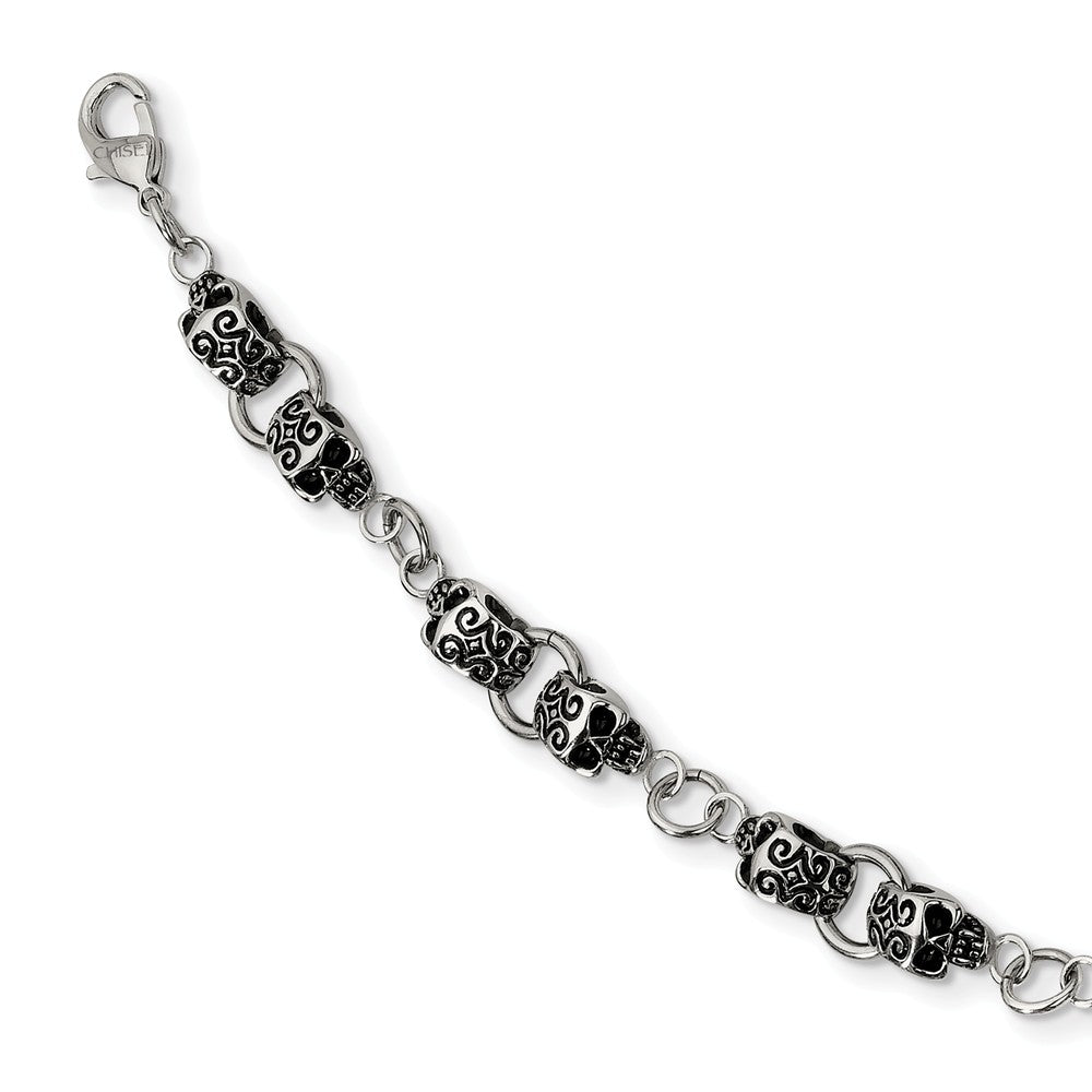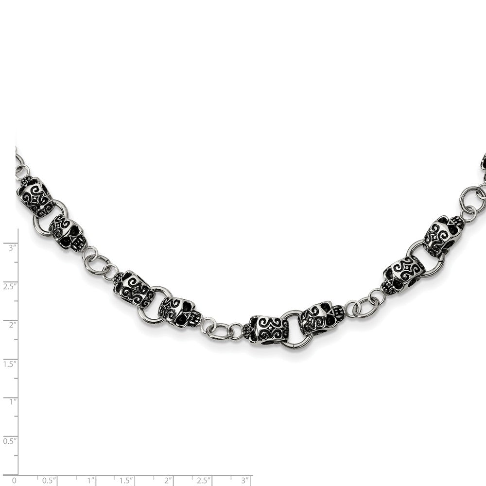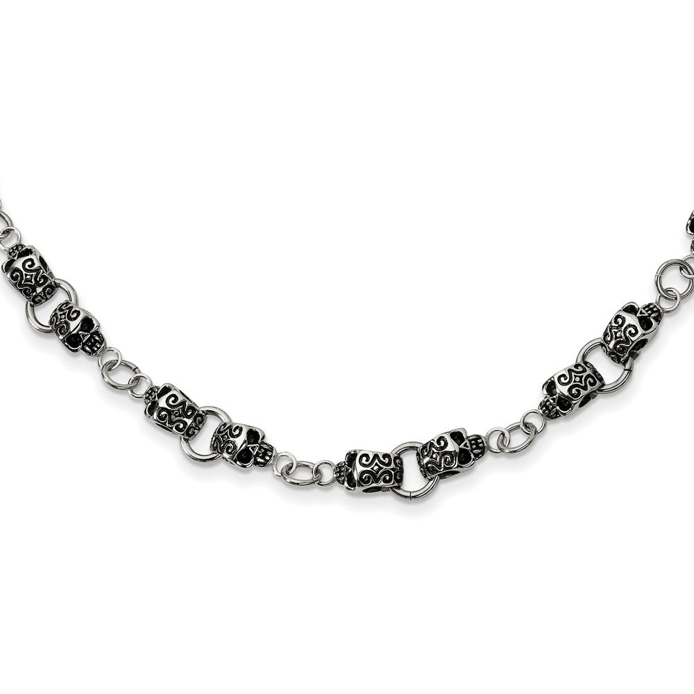 This tattooed skull necklace is crafted from stainless steel and features indigenous-script tattooed skulls that are approximately 12mm (7/16 inch) in width. The necklace is 24 inches long including the lobster clasp and has a antiqued, polished finish.