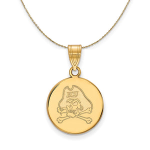 If you are a fan of East Carolina University and the Pirates then you need to show your school spirit with this East Carolina University pendant. We are a certified college jewelry retailer and this authentic item is officially licensed. It is crafted from 14k Yellow Gold and crafted by LogoArt in the USA. Includes a 16 inch, 0.8mm 14k yellow gold cable chain with a lobster clasp.