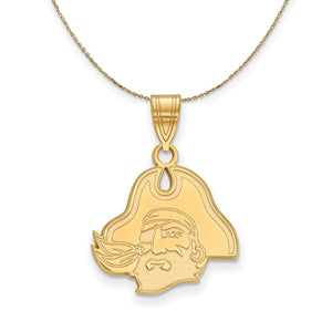 • If you are a fan of East Carolina University and the Pirates then you need to show your school spirit with this East Carolina University pendant. We are a certified college jewelry retailer and this authentic item is officially licensed. It is crafted from 14k Yellow Gold and crafted by LogoArt in the USA. Includes a 20 inch, 0.8mm 14k yellow gold cable chain with a lobster clasp.