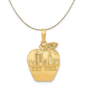 Capture the unforgettable moments of a past journey or keep your future travel dreams alive with this 14k yellow gold New York apple charm. It features a polished and textured design and is approximately 15mm (9/16 inch) in width by 23mm (15/16 Inch) in length, which includes the tapered bail. The pendant is Includes a 16 inch, 0.8mm 14k yellow gold cable chain with a lobster clasp.