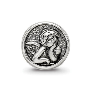 This spiritual charm cast in antiqued sterling silver features an angel with wings and measures approximately 10mm in diameter with a 4mm center. All of our charms are interchangeable as well as compatible with Reflections and other popular 3mm width bead style bracelets and necklaces.