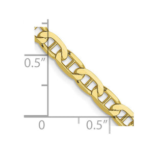 This polished anchor or mariner chain made of 10k yellow gold features a solid concave design that mimics the cable used to anchor boats with a vertical bar in the middle of each link. The 3.75mm width, 24-inch length makes a beautiful necklace for both men or women and is perfect paired with your favorite pendant or other chains for a layered look. Closes with a reliable lobster claw clasp.