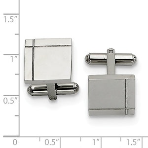 Refine your subtle style with these polished stainless steel cuff links featuring a grooved edge design that is suitable for engraving and a bullet back closure. The flat tops are approximately 15mm (9/16 inch) in width by 13mm (1/2 inch) in length.