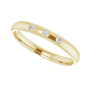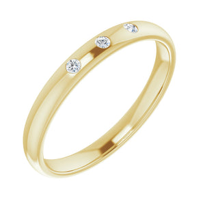 Category: *Style - Traditional 14K Yellow Gold 2.50 mm Band Design - 3 Stone Design - Domed Diamond - White Diamond Clarity: SI2-SI3 Diamond Color: G-H Diamond Shape: Round Diamond Weight: 0.06 Carats Finish - Polished Fit Type - Comfort Gemstone Size 10 Size 10.5 Size 11 Size 11.5 Size 12 Size 12.5 Size 13 Size 13.5 Size 14 Size 5 Size 5.5 Size 6 Size 6.5 Size 7 Size 7.5 Size 8 Size 8.5 Size 9 Size 9.5 Wedding Womens