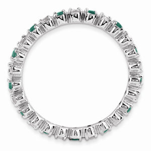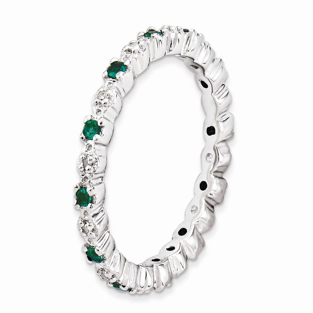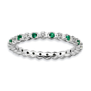 Created Emerald, May's birthstone symbolizes luck, creativity and well-being; bringing wisdom and reason. Diamonds of course are said to be a girl's best friend. This 2.5mm wide band fashioned from rhodium plated sterling silver is prong set with alternating gemstones all the way around. Guaranteed to fit together perfectly with all of the mix and match Stackable Expressions rings. Diamond treatment: natural, not enhanced.