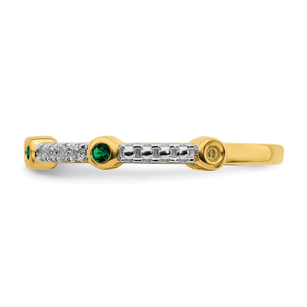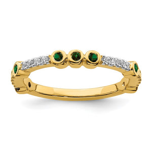 Make it simple and stylish with bands of different textures, finishes, widths and colors or extravagant with diamonds and gemstones! This stackable ring created from solid 14k yellow gold features 5 bezel set lab created-emerald gemstones totaling .8 of a carat and 8 prong set genuine diamonds totaling .8 of a carat. The natural diamonds are I2 in clarity and I-J in color. The approximate band width is 2mm. Guaranteed to fit together perfectly with all of the mix and match Stackable Expressions rings. The color range varies on all lab created gemstones so please allow for slight variations in shades. The color on your screen may also not reflect actual gemstone color due to variations in monitors.