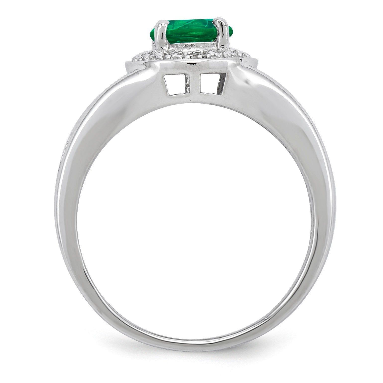 A 6mm faceted created emerald crowns the center of this diamond accented halo style ring. It is designed from sterling silver with a rhodium plated finish to retain its bright gleaming appearance. Top width is approximately 9mm (3/8 inch). The two natural diamonds are H-I in color, I2-I3 in clarity and the total diamond weight is .1 of a carat.
