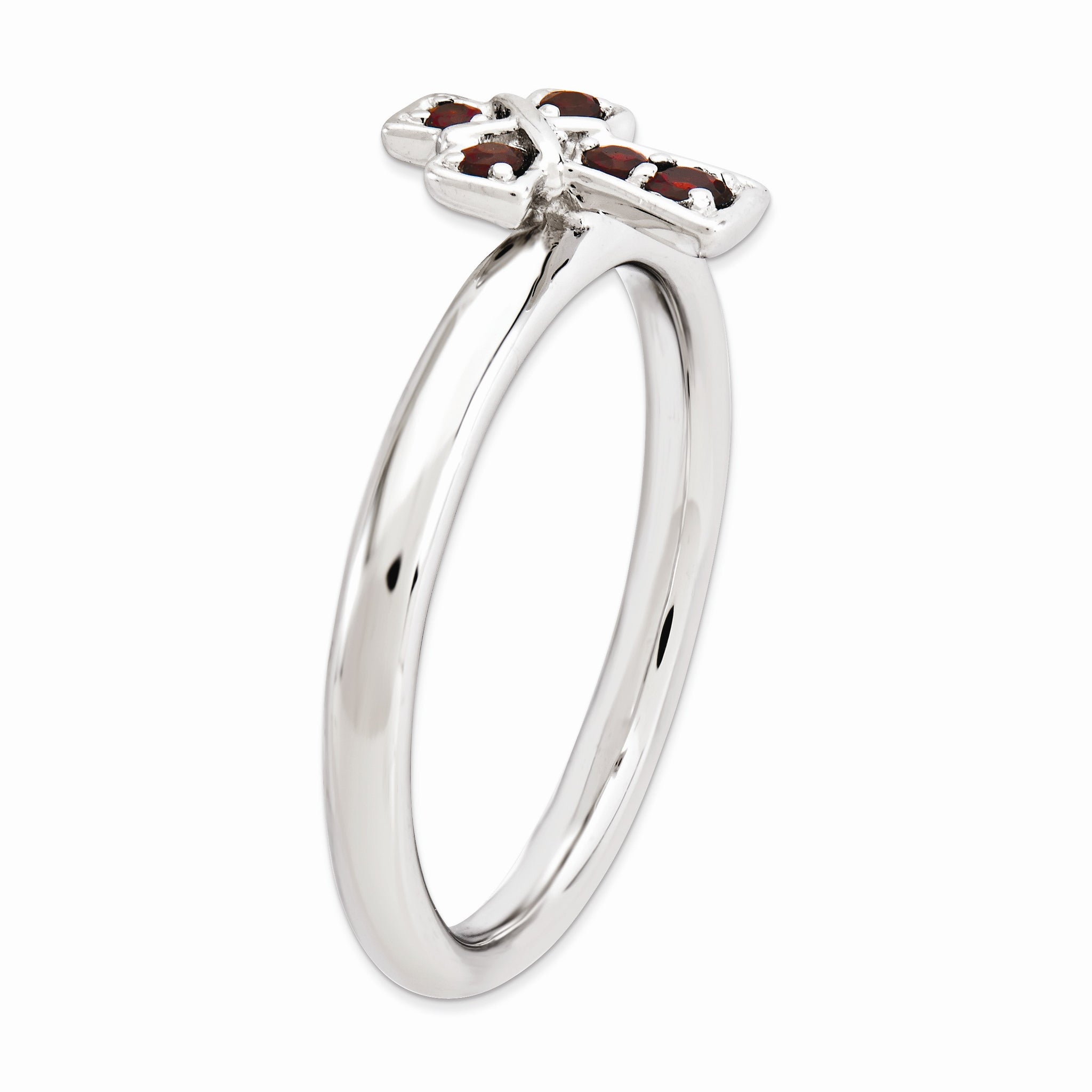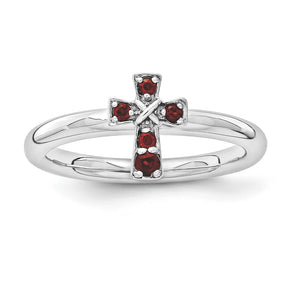 Customize a look that reflects your own unique style with a gemstone cross ring designed to celebrate your devout faith! This polished ring fashioned from tarnish resistant rhodium plated sterling silver features a 7 x 9mm cross prong set with a genuine garnets and a 2.5mm width band. The natural untreated garnets are 1. Mm to 2mm in size and the total gemstone weight is .1 carats. The color range varies on natural gemstones so please allow for slight variations in shades. Wear it alone or in meaningful combinations, guaranteed to fit together perfectly with all of the mix and match Stackable Expressions rings.
