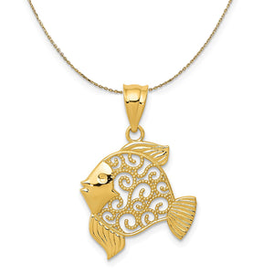 Marine life treasures, beautiful and bizarre creatures of the vast seas artistically sculpted in 14k yellow gold. This two-dimensional fish features a textured filigree design with a high polished finish that is approximately 17mm (5/8 Inch) in width by 25mm (1 Inch) in length, which includes the tapered bail. The pendant is . Includes a 20 inch, 0.8mm 14k yellow gold cable chain with a lobster clasp.