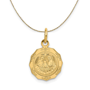 Baptism is a sacrament of initiation, welcoming members into the church, In the name of the Father, and of the Son, and of the Holy Spirit. Crafted from 14 karat gold with a polished and satin finish. Charm measures 1/2 Inch in diameter. Includes a 16 inch long, 0.9mm wide, solid 14k yellow gold cable chain with a spring ring clasp.