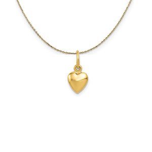 This tiny puffed heart charm fashioned from polished 14k yellow gold is finished with a standard jump ring that easily slips onto a necklace chain or charm bangle of your choice. This heart measures approximately 7mm (1/4 inch) and features a solid 3-D design. Includes a 20 inch long, 0.9mm wide, solid 14k yellow gold cable chain with a spring ring clasp.